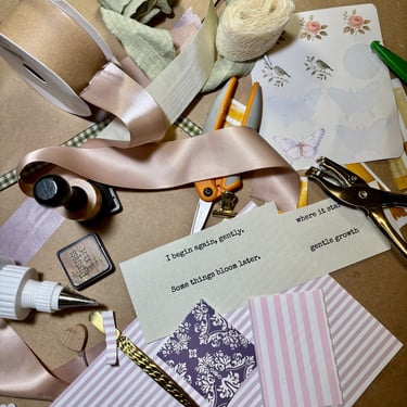 The Pages at Hand creative journaling box is thoughtfully filled with a curated selection of patterned paper, ephemera, embellishments, supplies, and so much more. Our first box's theme is "Paper and Petals," a limited run currently in the works and for sale in March 2026. Join our email list (below) to stay in the know.